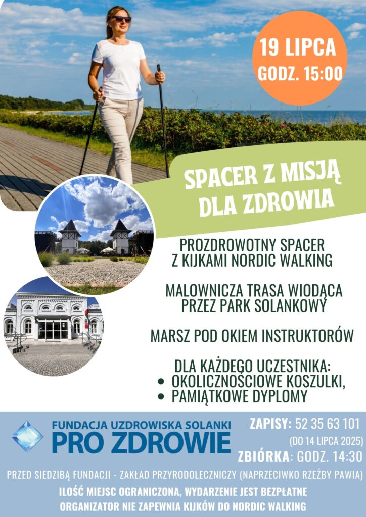 W sobotę, 19 lipca 2025 roku, Park Solankowy w Inowrocławiu stanie się miejscem szczególnego wydarzenia promującego zdrowy styl życia i aktywność fizyczną. Fundacja Uzdrowiska Solanki Pro Zdrowie zaprasza mieszkańców, kuracjuszy i gości odwiedzających Inowrocław do udziału w spacerze kijkami Nordic Walking pod hasłem: „Spacer z misją dla zdrowia”.